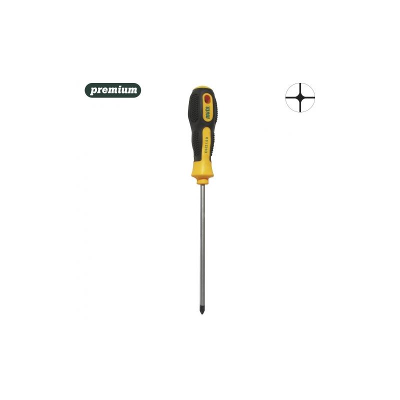 El mango de este destornillador philips de Mota está fabricado en tricapa plástico y goma de inyección suave.