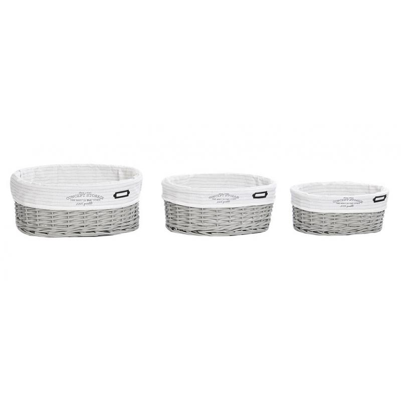 Cestas mimbre color gris ovaladas forradas en tela color blanco en un diseño romántico y actual.