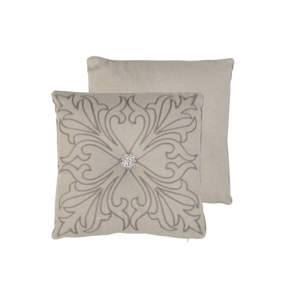 Cojín decorativo cuadrado con hojas bordadas en tonos tierra con aplique de pedrería. Este cojín tiene unas medidas de 45x45 cms con un grosor de 13 cms ideal para decorar el salón o el dormitorio.